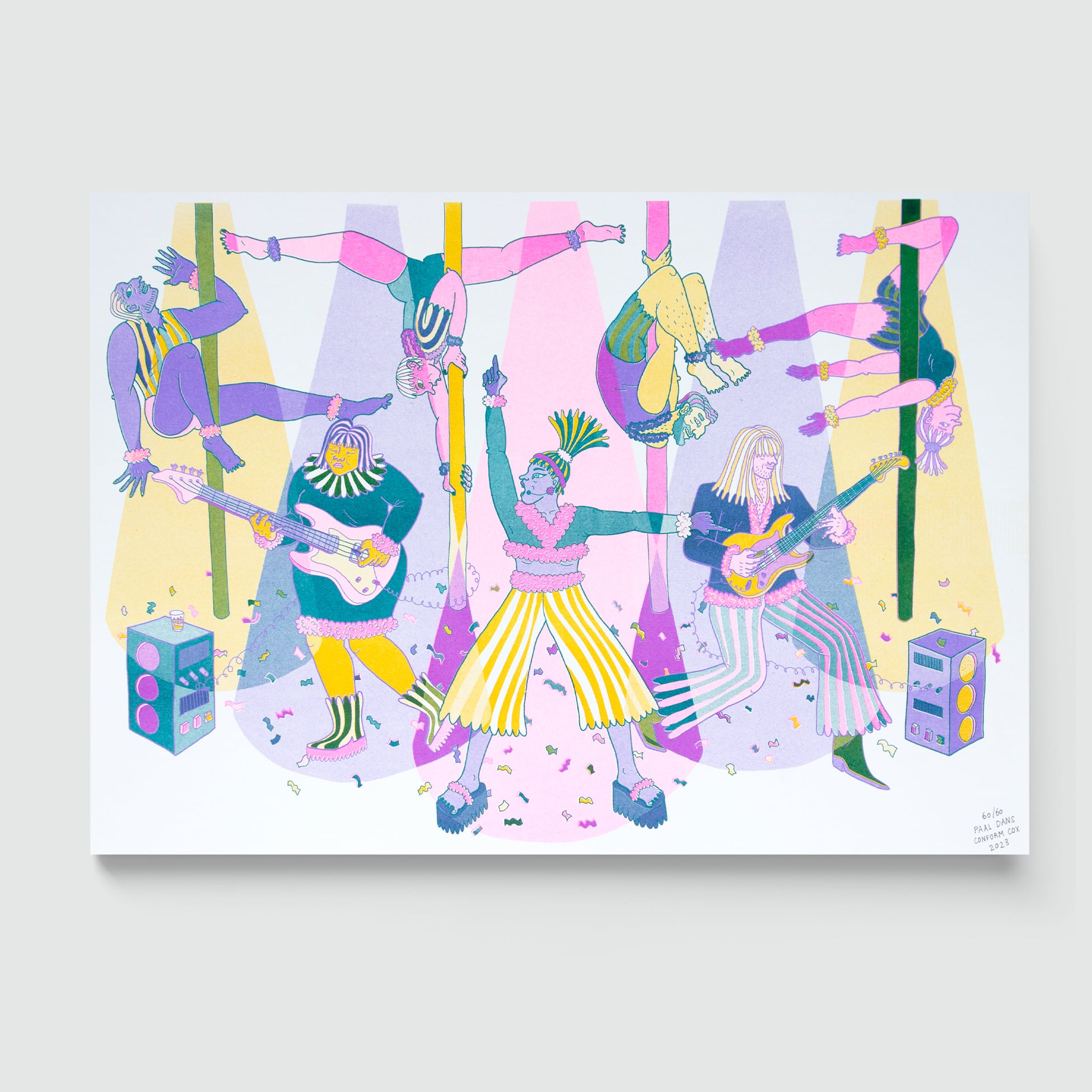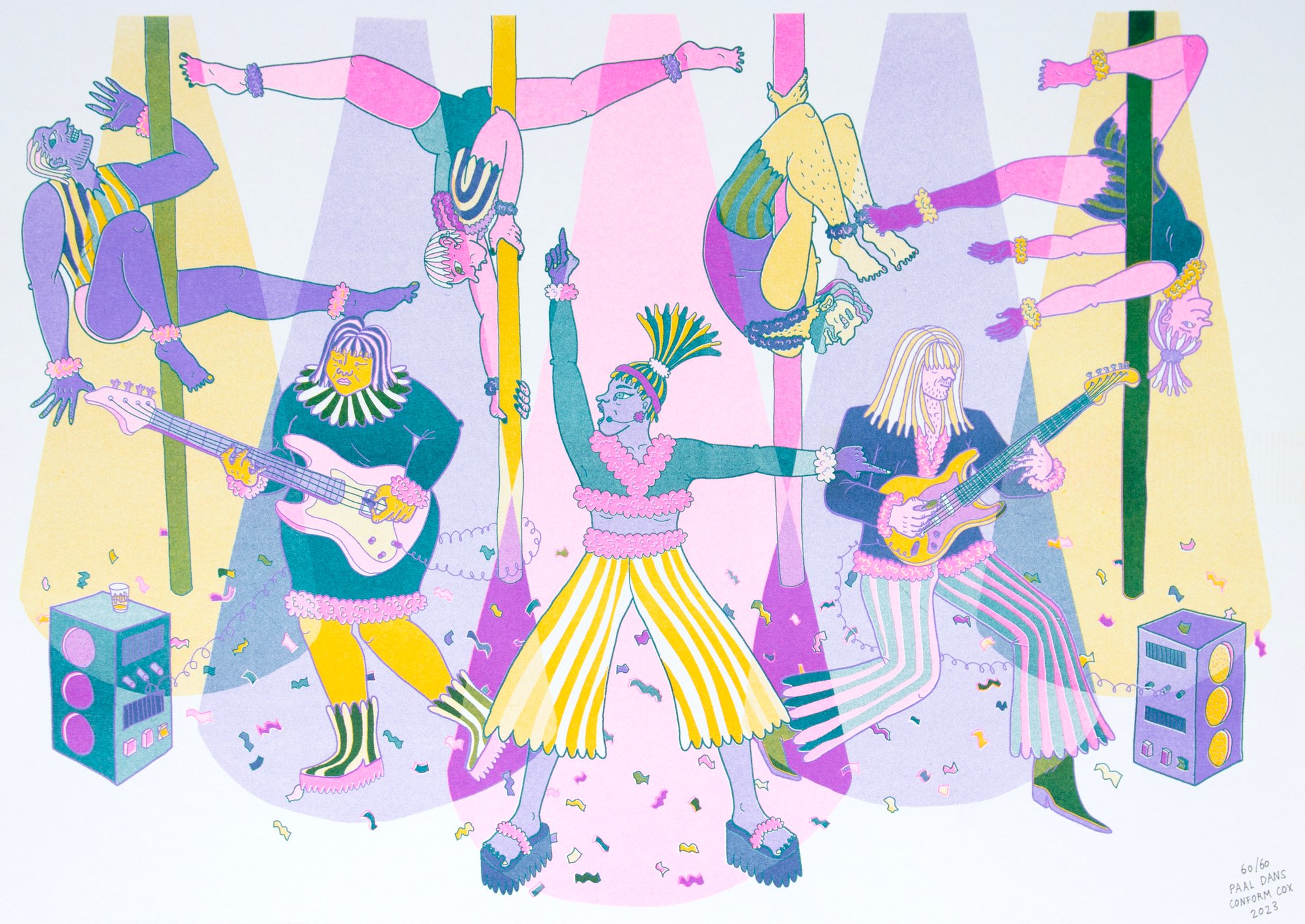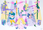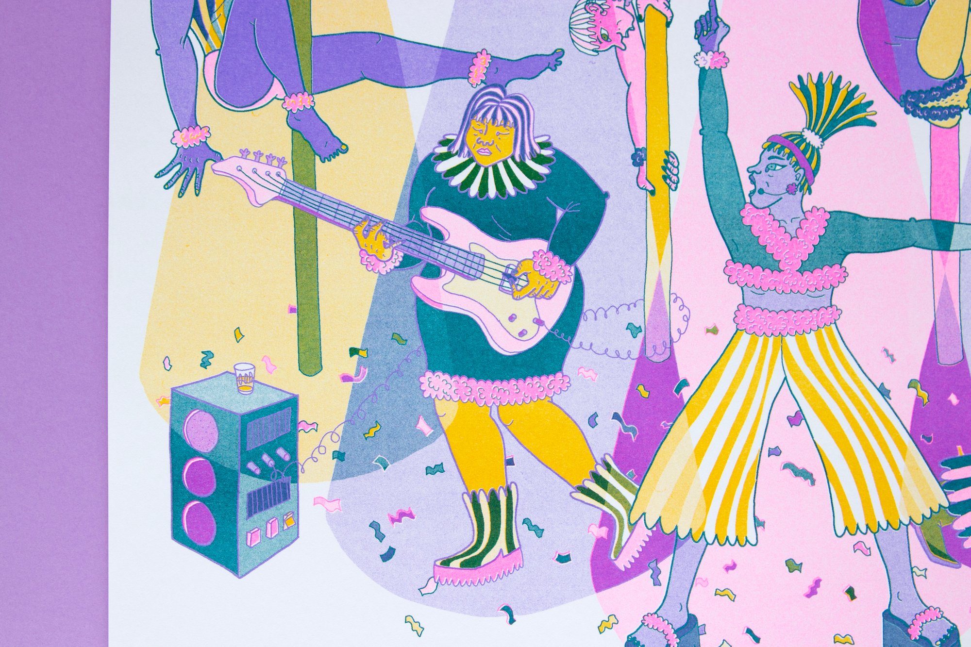 Inspired by different kind of 'dance floors' I am making a series of riso-prints where I imagine how the people interact in this situation. I always like to show the different shapes a human body can be in and to integrate some hidden story in every print.